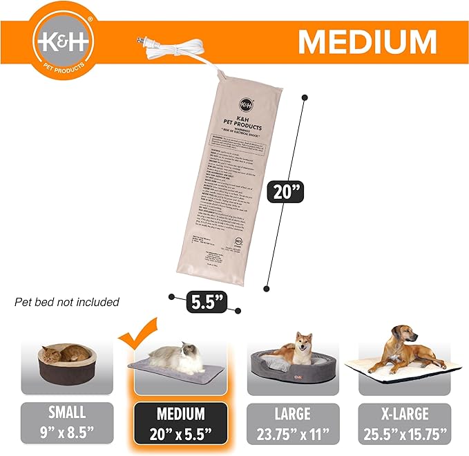 - SIZE & ENERGY-EFFICIENT: K&H Medium Pet Bed Warmer measures 20" x 5Β½", making it perfect for medium pet beds, and it uses only 6 watts of power, ensuring low energy consumption while providing cozy warmth for your pet