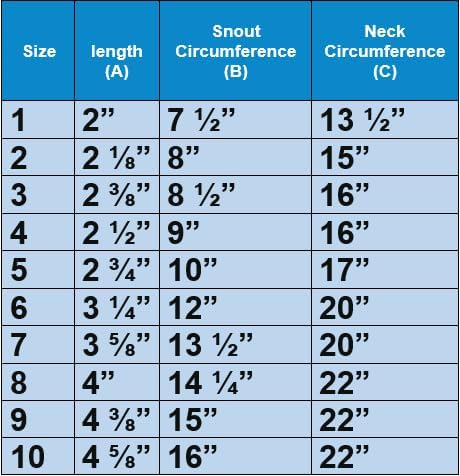 - PLEASE MEASURE BEFORE BUYING: Please refer to the product description or image section for an in-depth chart on how to size your dog. Measure from the tip of the nose to the slope below their eyes for snout length (Length A in Chart). Snout Circumference should be measured around the widest part of the snout with the dogβs mouth closed, just below the eyes (Snout B in Chart). The Neck circumference is measured around the neck right behind the ears (Neck C in Chart). If the circumference measurement fits one of the sizes in the chart, but the length of the snout is over the maximum range for that size, you should choose the next size for a better fit.