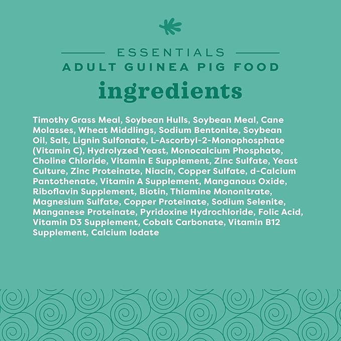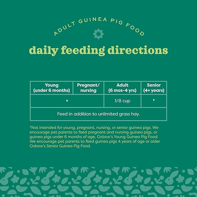 - FEEDING INSTRUCTIONS: Mature Guinea Pigs (over 6 months) Feed 1/8 cup pellets daily in addition to unlimited grass hay. Although Essentials - Adult Guinea Pig Food is an excellent complete feed for guinea pigs, unlimited access to fresh grass hay should also be provided.