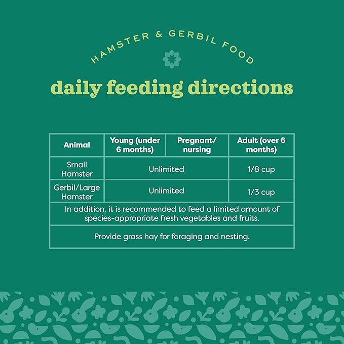 - FEEDING INSTRUCTIONS: Young, Pregnant, or Nursing Hamsters and Gerbils (under 6 months) Unlimited pellets daily. For adult Hamsters and Gerbils (over 6 months), feed according to weight specifications provided.
