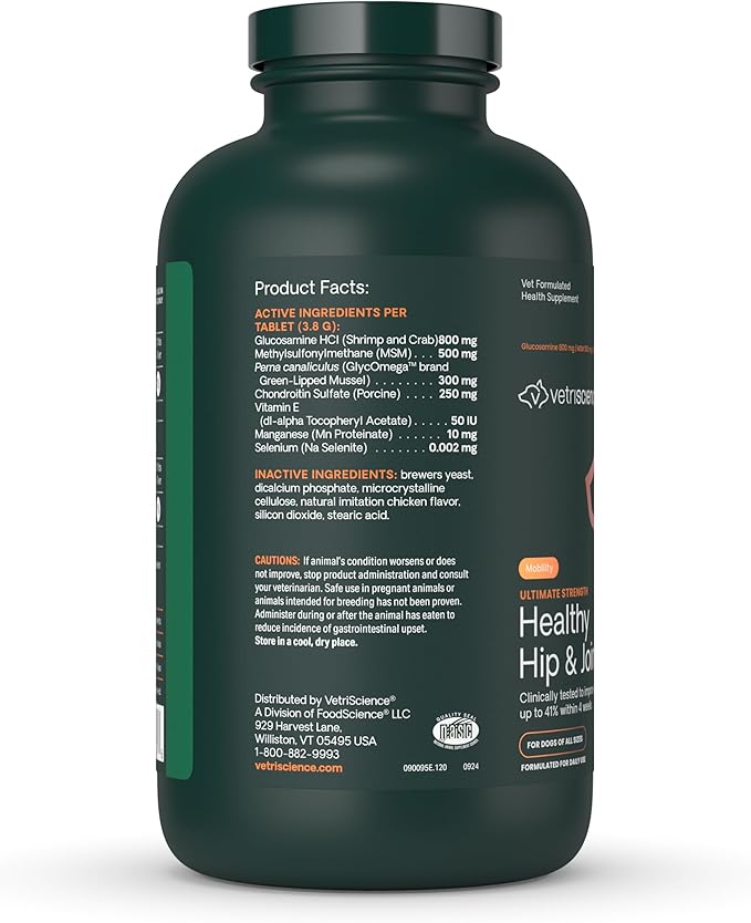VetriScience Ultimate Strength Healthy Hip & Joint Chewable Tablets, GlycoFlex Glucosamine, Chondroitin and Green-Lipped Mussel Joint Supplement for Dogs, Soothe Joint Discomfort, Chicken, 120 Count