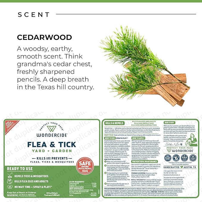 - SPRAY & PLAY CONVENIENCE! PRE-MIXED & READY TO USE. Safe around cats, dogs and people of all ages when used as directed, with no wait time for drying or reentry into sprayed areas and environments. Just attach directly to a garden hose, spray your backyard, and enjoy. Keep the bottle & refill the sprayer with Wondercide Flea and Tick Yard and Garden concentrate.