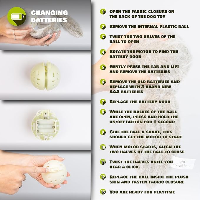 - BATTERY OPERATED PROLONGED PLAY – To change batteries, remove the plastic ball from plush toy cover. Use tab to open the giggle dog toy ball. Remove the battery compartment and insert 3 AAA batteries. This interactive dog toy has an automatic stop feature after a period without use to extend battery life. (Batteries are included with the Hyper Pet Doggie Tail)