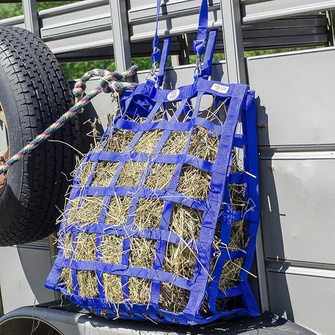 • HOLDS 2-3 FLAKES OF HAY - this 24x10x24" hay bag with 3.5x3” rectangular openings holds approx. 2-3 flakes of Timothy, Orchard, Alfalfa, or any other type of hay. Our hay bags were designed to minimize frustration and can be stuffed in seconds.