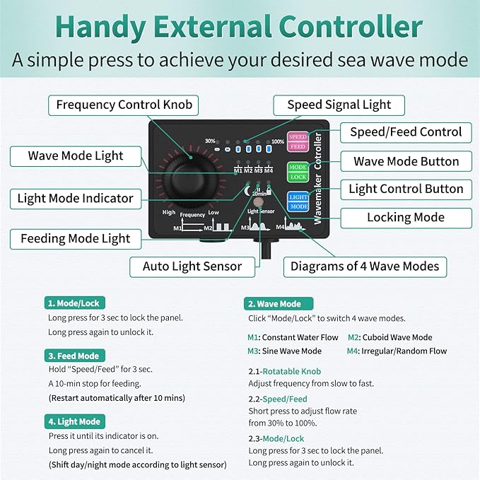 - 4 Optional Waves: Press the βmodeβ button to switch between 4 wave modes (M1/M2/M3/M4). Easily achieve multiple sea waves with a simple controlling panel.