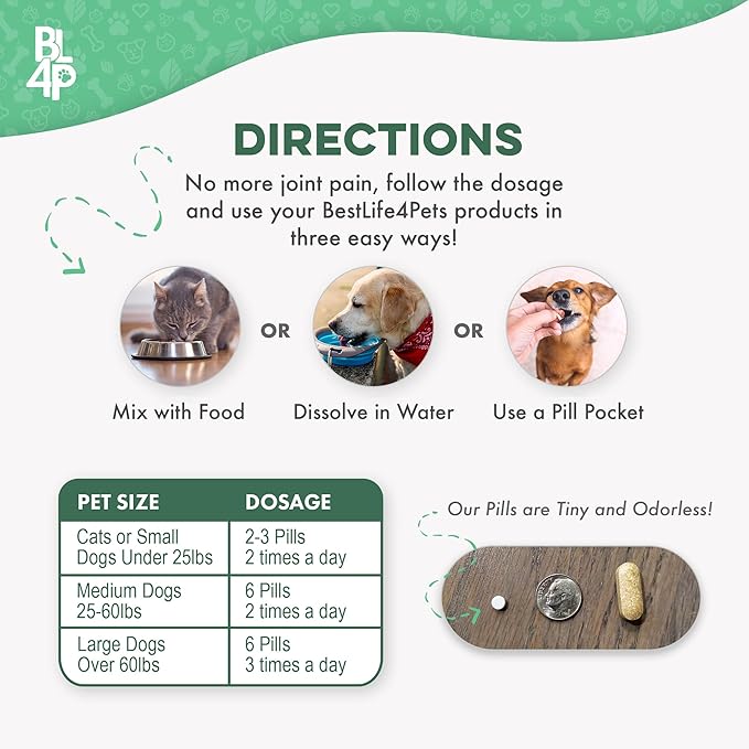 - No Fuss, Easy to Give: We know the struggle to try and administer meds to your pet. That's why our joint pain relief small, odorless, and tasteless pills are made to be easily hidden in treats, a pill pocket, added to wet or dry food, or even crushed and dissolved in water, making administration stress-free for both you and your furry friends.