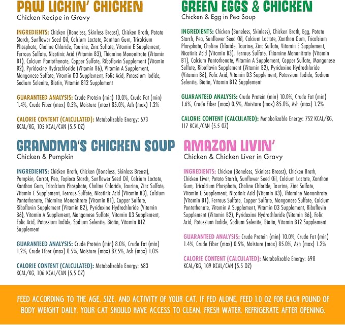 - Variey Pack includes 6 cans of each: Paw Lickin’ Chicken, Green Eggs & Chicken, Grandma’s Chicken Soup and Nine Liver.