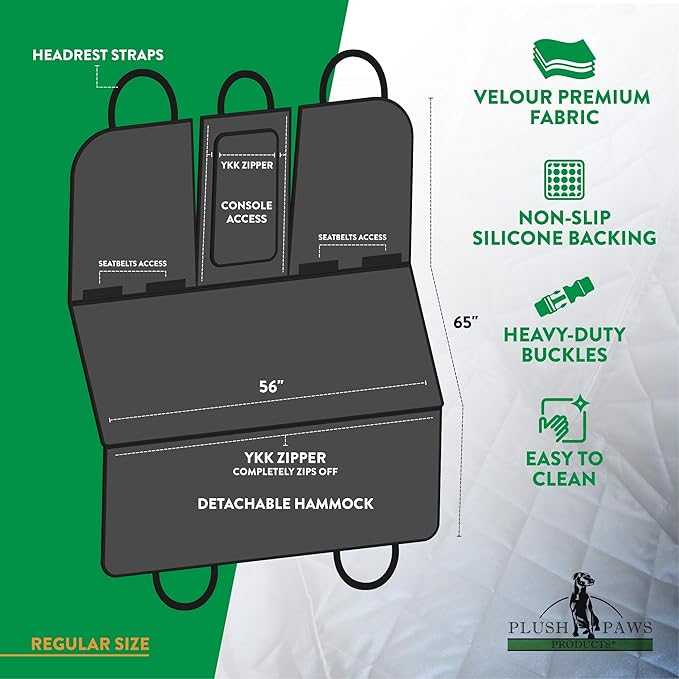 - πππ¦π¬ π§π’ ππ‘π¦π§πππ: Our sizes options are REGULAR - 55''W X 60''L, EXTRA LARGE - 63''W X 68''L, and all have 9'' X 18'' SIDE FLAPS. This elastic skirt and adjustable back and headrest straps provide a seamless clean look and snug fit. Buckle the dog car seat protector to your back seat using the adjustable back strap and insert the seat anchors to secure the cover in place. The headrest strap fits most vehicles.