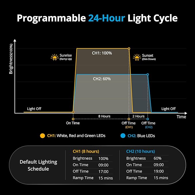 - Provides more options to adjust the auto On/Off time and brightness. Featured 15 or 30-minute ramp-up and dim-down to simulate natural sunrise and sunset, waking the fish up in soft lighting and ensuring a good sleep with complete off at night