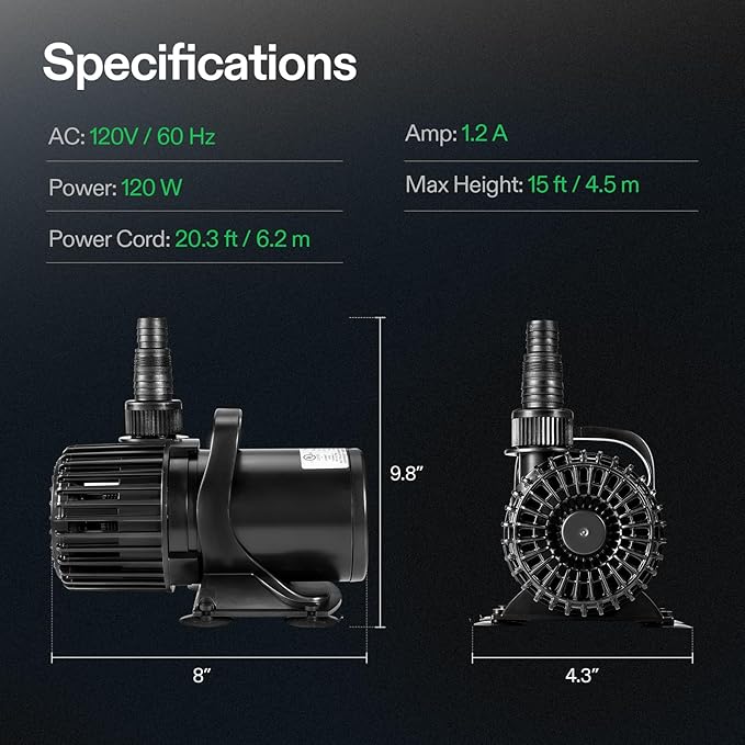 - Energy Saving with Low Noise: Ultra-quiet operation design (30-40 dB); Less power consumption (120W) with higher output (2700GPH/10000LPH) as compared to other pumps; Itβs fit for 420-gallon pond
