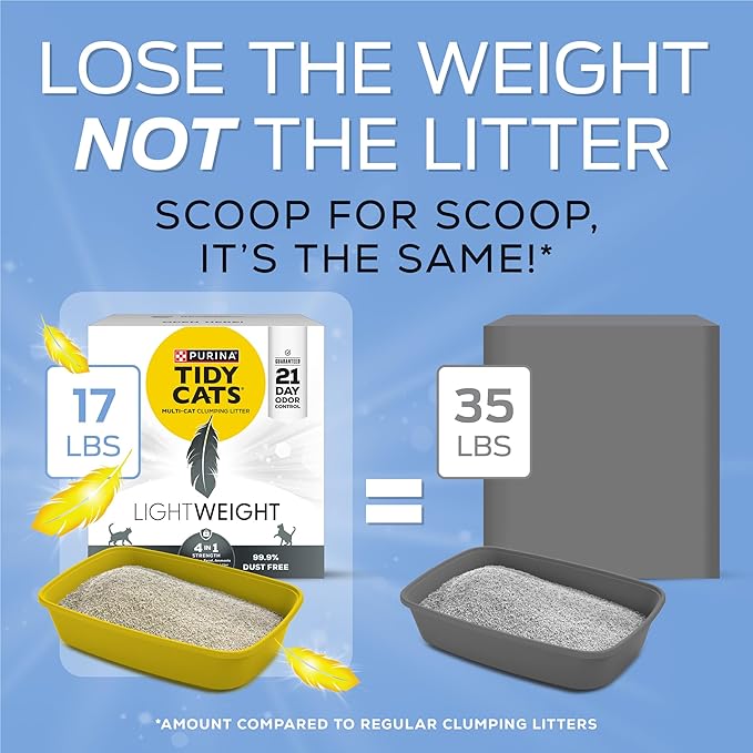 - LIGHTER CAT LITTER: Tidy Cats cat litter lightweight formula is 50 percent lighter than the leading clumping litter--less weight, not less litter.