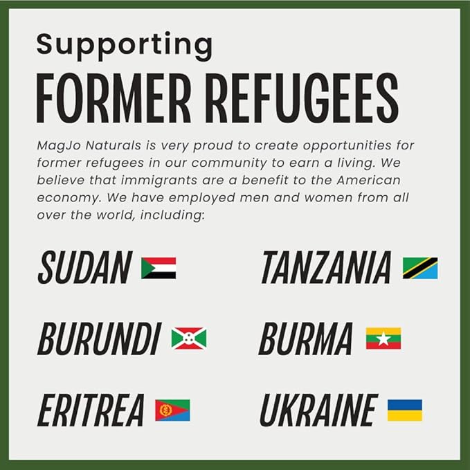 - About MagJo Naturals: We are proud employers of former refugees who are trying to restart their lives in the USA. We believe immigrants are a benefit to our nation. All of our sold products employ as many former refugees as our business can sustain