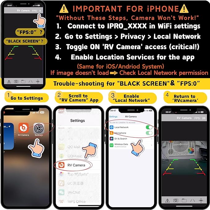 - Troubleshooting: For iPhone users experiencing "Black Screen" or "FPS=0", enable "Local Network" access in Settings: go to Privacy and turn ON "RV Camera" access (critical); For connectivity issues: confirm Local Network permissions, disable VPN, and maintain a distance within 30ft