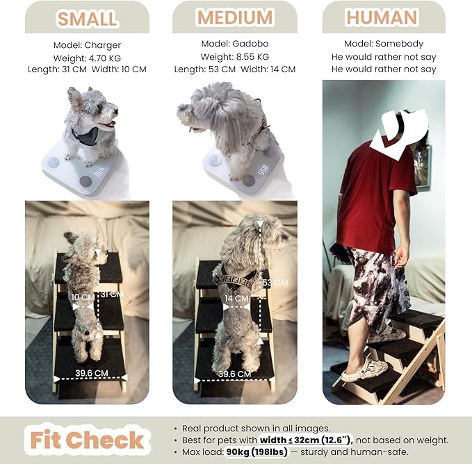 - 5. Size & Weight Capacity Step:15.6" L x 9.3" W x 5.9" H in 3-step full open: 24.8" L x 17.2" W x 19.5" H in. Folded: 31" L x 17.2" W x 3.15" H in Max load: 100kg / 220lbs. Designed for small and medium dogs and cats with waist width ≤32cm / 12.6in.