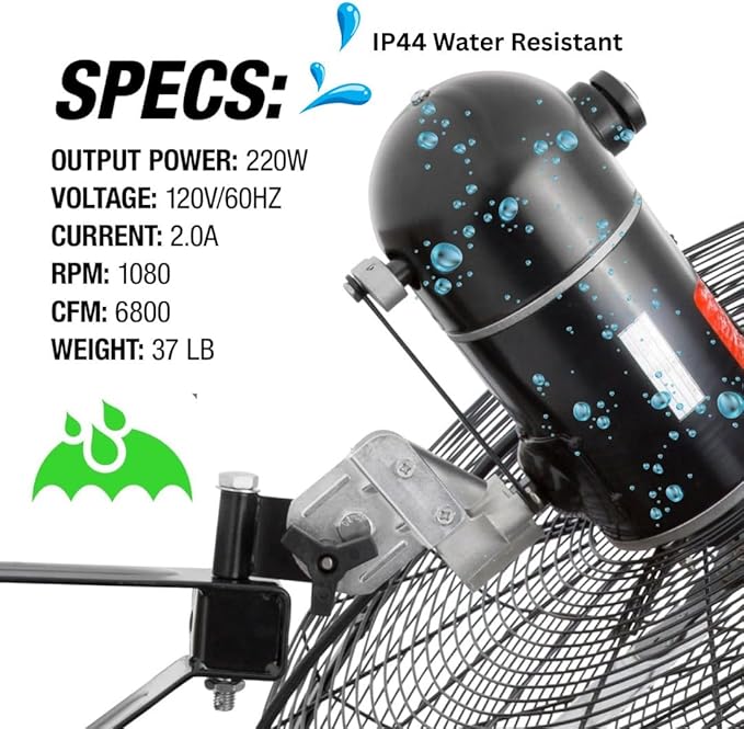 - High-Capacity Airflow: The 24" industrial wall mounted fan delivers powerful airflow with a capacity of 6800 CFM, making this industrial fan ideal for cooling large spaces such as garages, workshops, or industrial facilities. It ensures consistent ventilation for improved comfort.