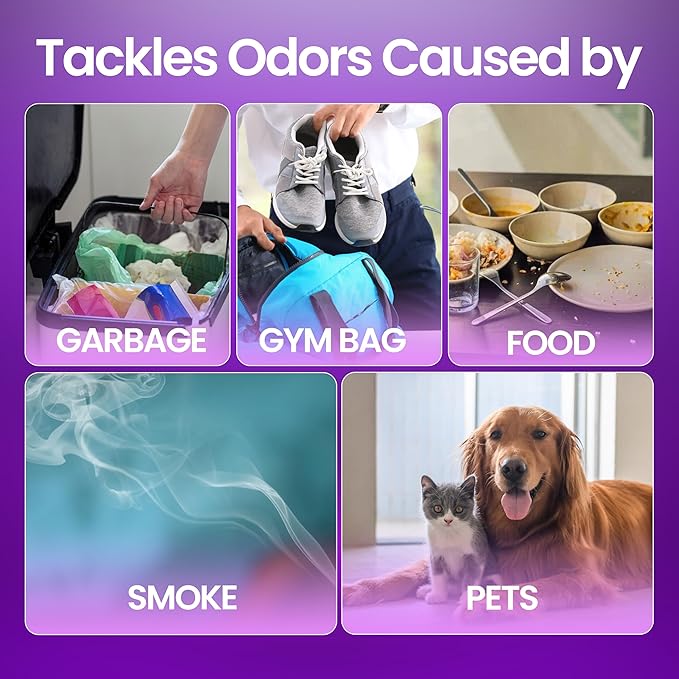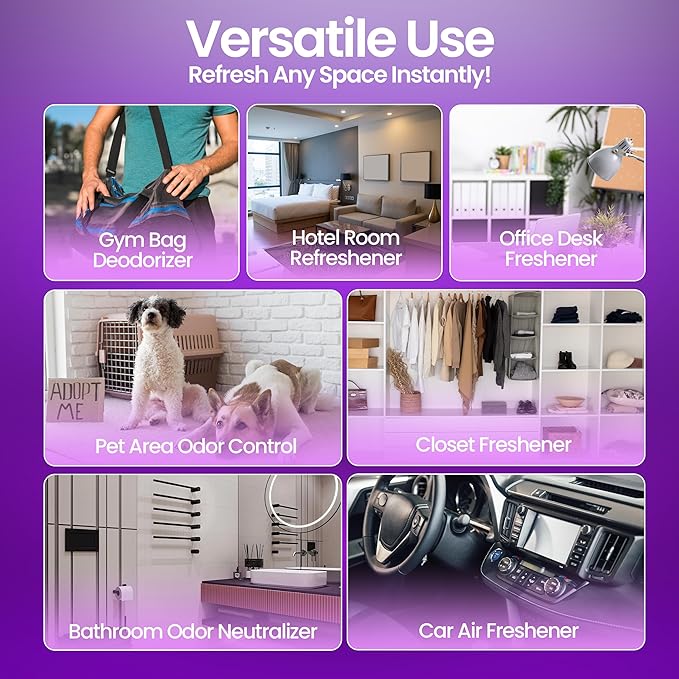 - Multi-Purpose Lavender Odor Eliminator Spray & Air Freshener: Effectively eliminates tough odors from shoes, carpets, upholstery, pet areas, trash cans, fridge, laundry, closets, basements, cars, and more. This lavender air freshener spray leaves your surroundings smelling fresh without harsh chemicals or residue.