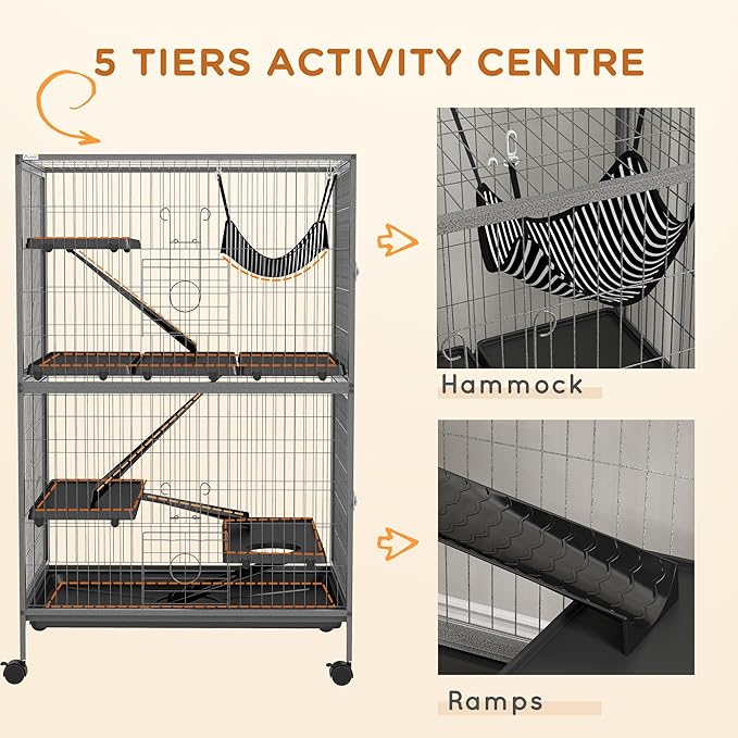 PawHut 50" 5-Tier Small Animal Cage, Ferret Cage, Large Chinchilla Cage with Hammock Accessory & Heavy-Duty Steel Wire, Small Animal Habitat with 4 Doors, Removable Tray, Gray