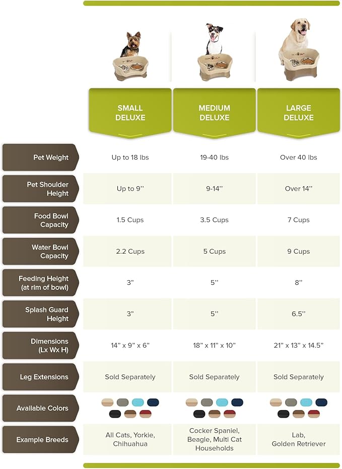 - ELEVATED DOG BOWLS FOR LARGE DOGS: Designed for large-sized dogs like Labradors and Golden Retrievers, the Neater Feeder Large Dog measures 21” L x 13” W x 14.5” H (with an 8” feeding height). The set includes a 3-cup slow feed bowl for food & a 9-cup extra-capacity water bowl.