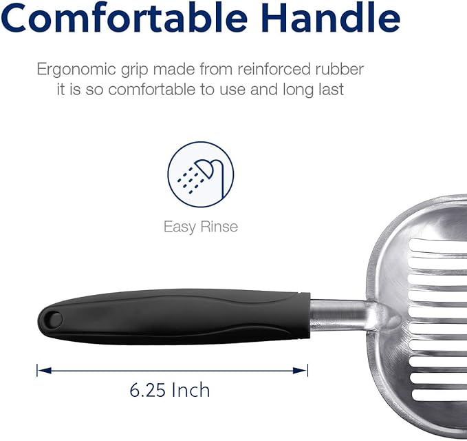 - [Functions]: The sharp edge helps to loosen clumps. The sifter area holds wet clumps and lets clean litter pass through easily. The long handle keeps you away from cat’s waste. It is designed to keep litter box clean and save you loads of cat litter.