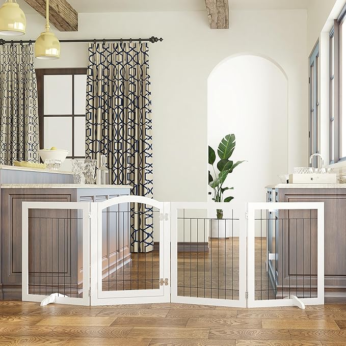 - MULTIPLE CONFIGURATIONS: Consists of 4 Pet Panels, Connected and Secured Together with Sturdy 360 Degree Hinges for Multiple Configurations. Use as A Pet Gate in Doorways Full Hallways or Any Wider Areas, or Connect Together as Playpen, Pet Exercise Pen or Play Yard.