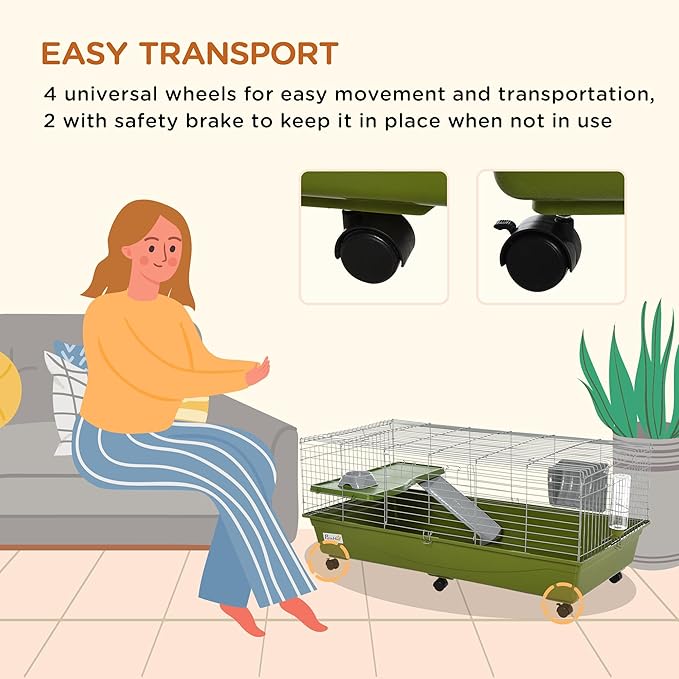 PawHut 47" L Small Animal Cage, Rolling Bunny Cage, Guinea Pig Cage with Food Dish, Water Bottle, Hay Feeder, Platform, Ramp for Chinchilla, Green