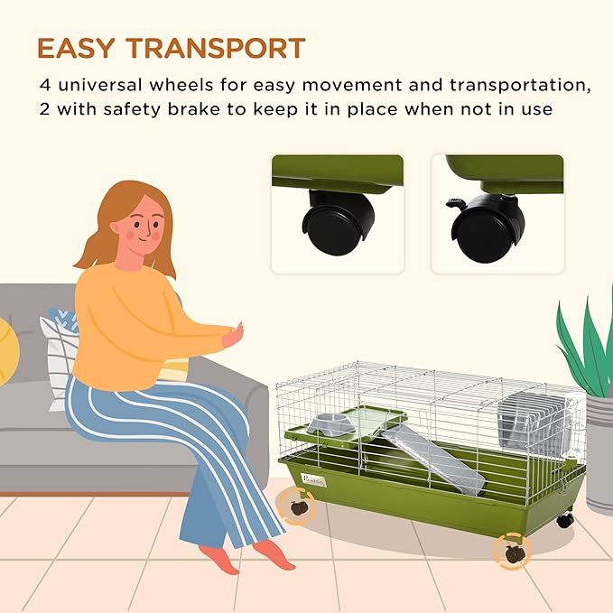 PawHut 35" L Small Animal Cage, Rolling Bunny Cage, Guinea Pig Cage with Food Dish, Water Bottle, Hay Feeder, Platform, Ramp for Chinchilla, Green