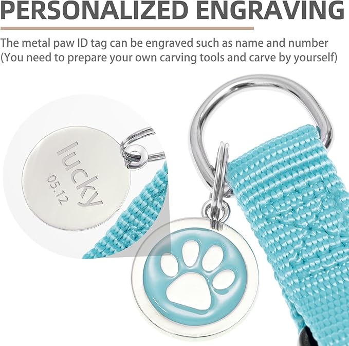 - [Cute ID Tag for DIY] - Each harness is equipped with a metal ID tag, and the front is a cute paw pattern, while on the back, you can engrave whatever you want, such as the dog's name and so on. It does not corrode as easily as wooden labels and is durable. You can also remove it when washing the harness.