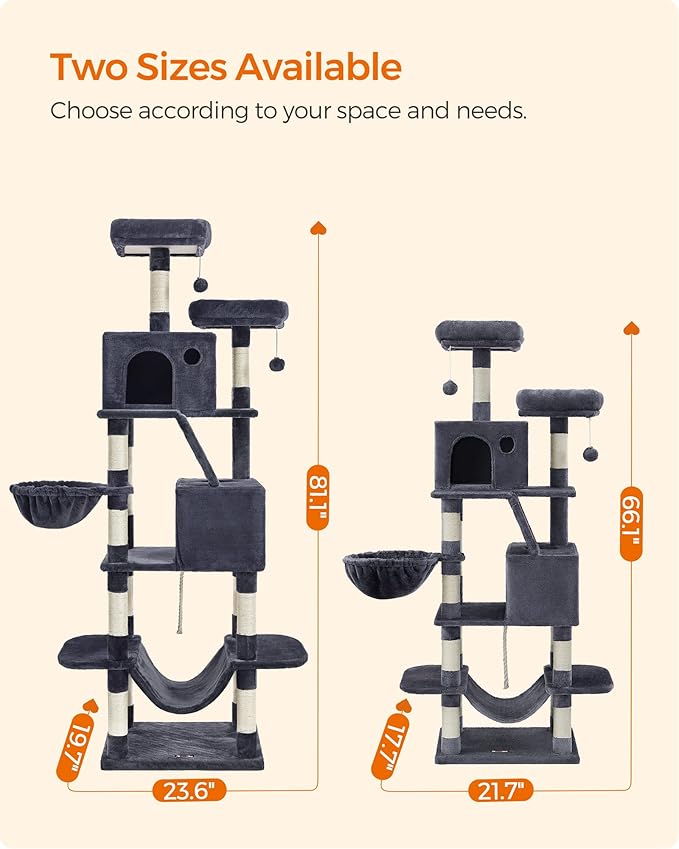 Feandrea Cat Tree, 81.1-Inch Large Cat Tower with 13 Scratching Posts, 2 Perches, 2 Caves, Basket, Hammock, Pompoms, Multi-Level Plush Cat Condo for Indoor Cats, Smoky Gray UPCT190G01