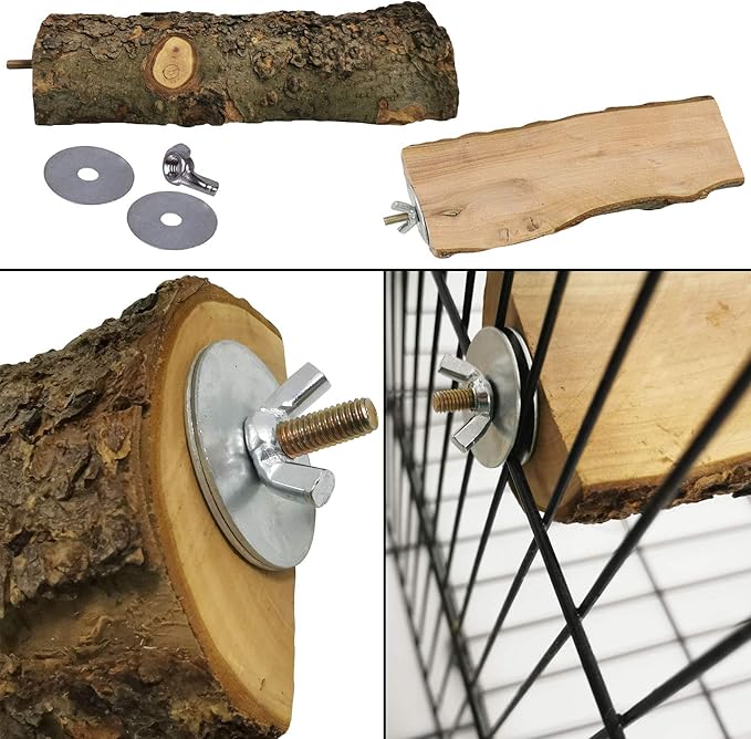- [EASY TO INSTALL] Perch built-in bolts and wing nuts.It can be installed inside or outside the cage to provide extra living and landing space for your pet and provide a safe and comfortable resting place for your pet.The chew toy can be hung in cages