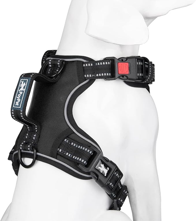 PoyPet No Pull Dog Harness, No Choke Front Clip Reflective Dog Vest with Soft Padded Vertical Handle, 3 Leash Attachments for Small Medium Large Dogs (Black,L)