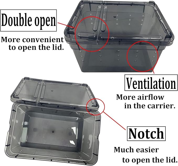 - PRACTICAL DESIGN: Designed with multiple vents, the reptile carrier has a stable ventilation system, which can keep the air circulation in the snake cage and let the animals breathe fresh air. After covering the lid, press the four corners firmly to make sure they close tightly and prevent pets from escaping