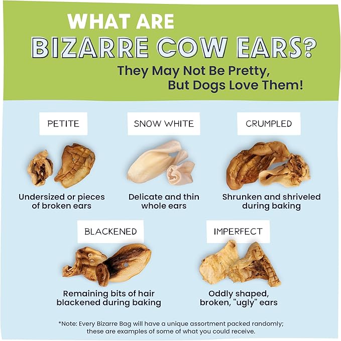 - A Fun Assortment of Cows Ears for Adventurous Pups: Our Bizarre Bargain Bag of Cow Treats for Dogs contain undersized, shriveled, blackened, or otherwise oddly shaped treats that are sure to delight a pup who loves variety. At Pawstruck, we're dedicated to bringing your pup great-tasting chews while eliminating food waste, reducing our carbon footprint, and helping you save money -- all while giving your fur kid great-tasting treats made from top quality ingredients.