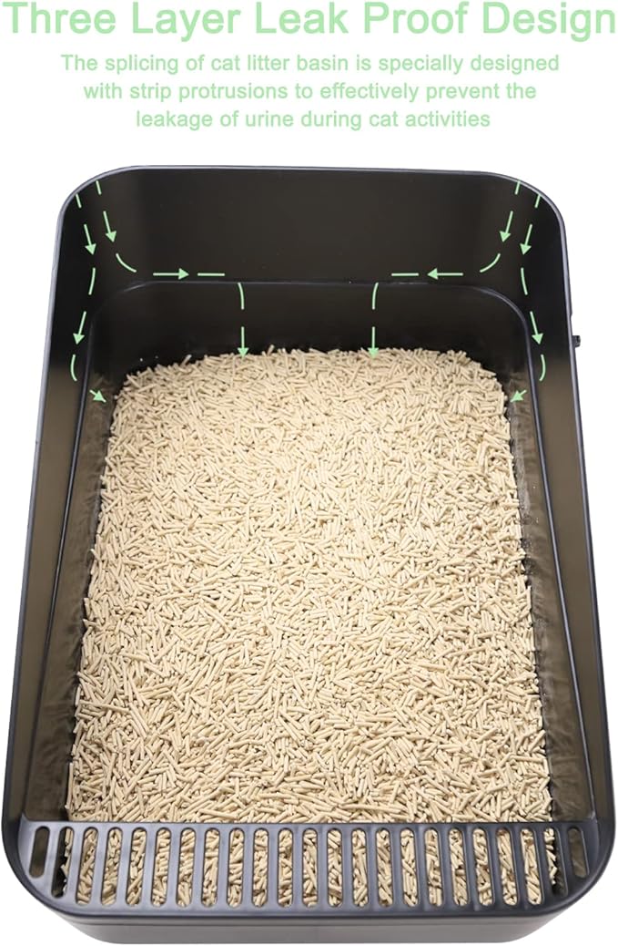 - Raised Enclosure. Litter box features a double barrier design with a high level fence to prevent urine leakage. The raised, streamlined fence design caters to the natural habit of cats of frequent entry and exit. It also prevents cats from jumping out and bringing out litter and urine, keeping the litter contained within the box. It is also easy to lift and move the litter box, giving you a clean home environment.