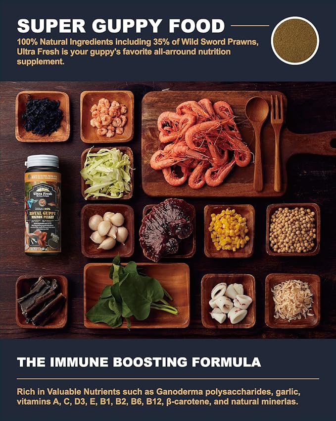 - High Palatability : Our guppy food contains up to 35% of wild sword prawns and all other 100% natural ingredients which make it highly nutritious without sacrificing superior taste—even the pickiest guppy can't resist it!