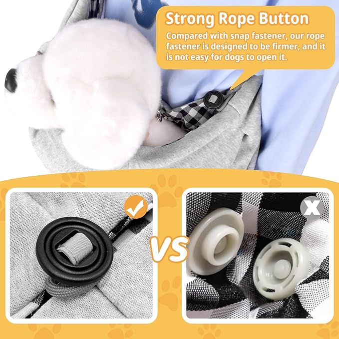 - 𝐀𝐝𝐣𝐮𝐬𝐭𝐚𝐛𝐥𝐞 𝐒𝐭𝐫𝐚𝐩 𝐃𝐨𝐠 𝐂𝐚𝐫𝐫𝐢𝐞𝐫𝐬: Our puppy carrier sling is feature with the POM buckle that you can easily to adjust the shoulder strap according to your built, find a comfortable position for walking; wide and thick strap spreads the weight over your shoulder and back, minimize the pain to carry pets. The length of the adjustable shoulder strap is 24 inches, which is suitable for everyone.