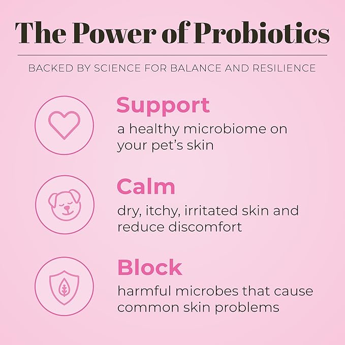 - Probiotic Formula- Each bottle contains topical probiotics that help support a healthy microbiome to defend against common skin problems such as itching, odor, dryness, dandruff, hot spots, and excessive shedding.