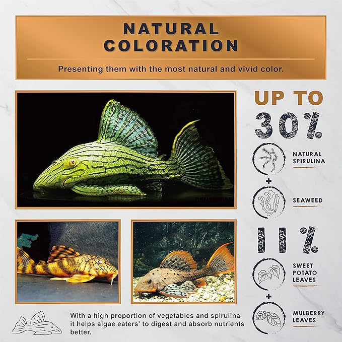 - β ALL NATURAL FLAVOR Formulated with high content of natural spirulina, seaweed, sweet potato leaves, mulberry leaves, wild sword prawns, garlic and a variety of carefully selected natural ingredients that delivers superb palatability and well balance nutrients for algae eaters. Even the pickiest ones can't resist it!
