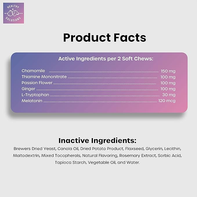 - πΈ VETERINARIAN FORMULATED -- with Melatonin, Chamomile, Passion Flower, Thiamine, L-Tryptophan, and Ginger to help soothe sensitive stomaches.