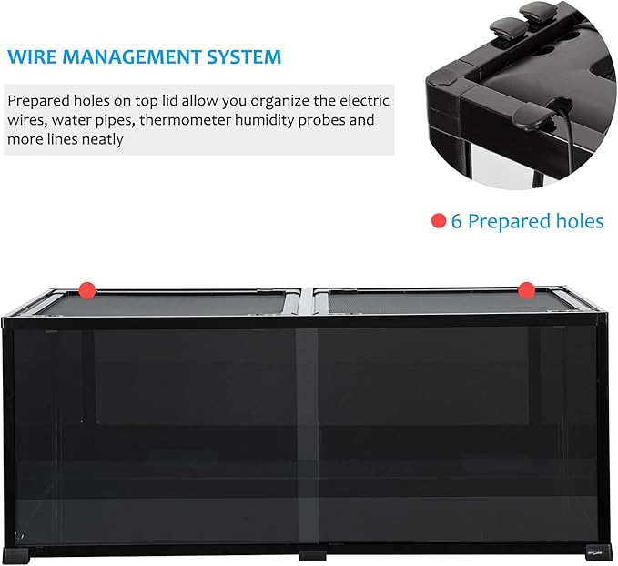 - 【Tempered Glass & Aluminum Frame】High quality tempered glass bottom base and aluminum alloy frame ensure this reptile terrarium is sturdy and safe. Raised bottom 0.5In in order to fit a substrate heater underneath, and waterproof bottom can be used as desert terrarium or rainforest tank.