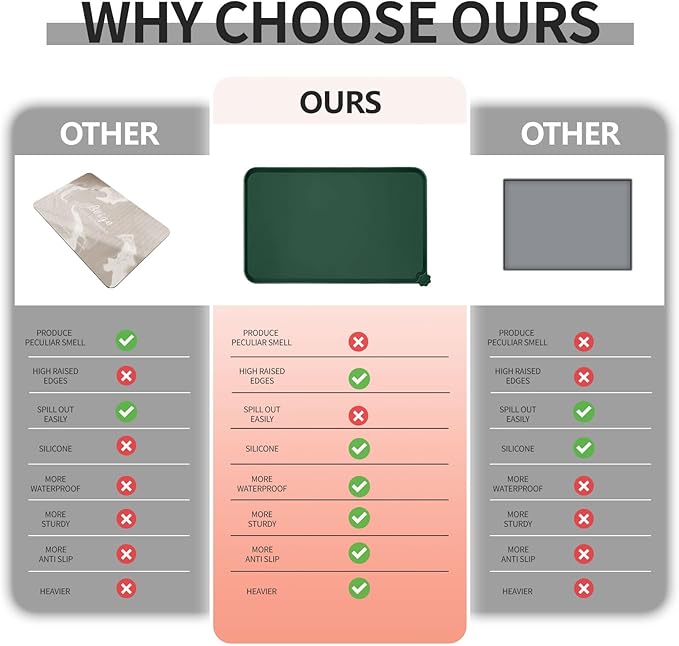 • Various sizes available: our pet mats come in 5 different sizes - 18.5" x 11.5", 22" x 14", 24" x 16", 28" x 18", and 32" x 24". Suitable for all kinds of pets, from puppies to large pets, choose the perfect size for your furry friends and avoid messy spills at mealtime