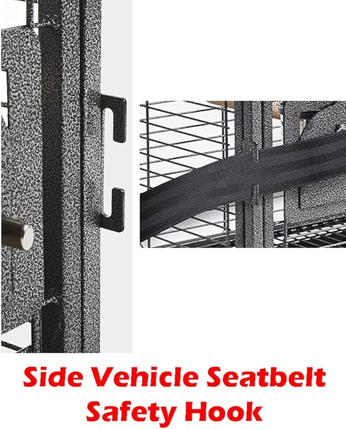 - 【CONVENIENCE】Portable Design. Top Easy Comfortable Carry Handle With Wooden Playing Stand For Your Bird, Swing Away Solid Metal Plate Feeder Door Prevent Seed Spillage With 2 x Stainless Steel Bowls On the Metal Ring. Large Easy Access Front Door: Size 13.5 x 13.5H. Side Vehicle Safety Seatbelt Hook Included.
