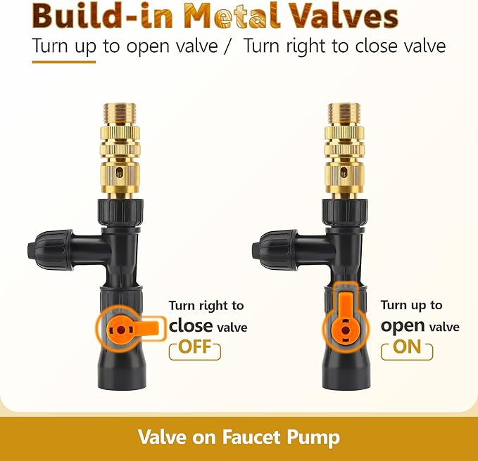 - Fits for most faucets: build-in 3 size metal adapters that can fits female 15/16-27 thread, 13/16-27 thread or a male 55/64-27 thread, constructed with on/off valve, the valve on the faucet pump can be control water flow direction. The valve on the gravel tube can be adjusted total water flow