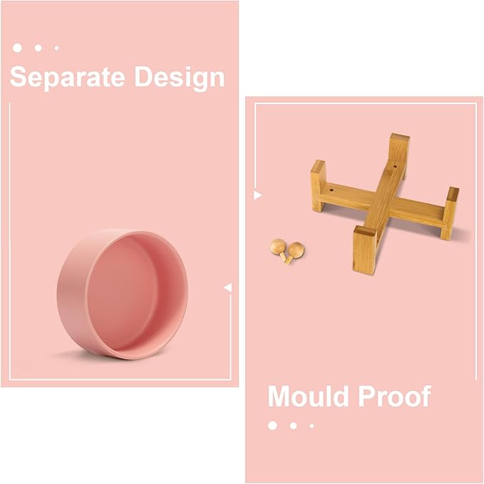 SPUNKYJUNKY 15° Slanted Ceramic Dog and Cat Bowl with Wooden Stand, Tilted Bulldog Food and Water Bowl No Slip Non-Spill for Cats Medium Dogs Big Face Pets 28.7 OZ (3.6 Cups,Pink)