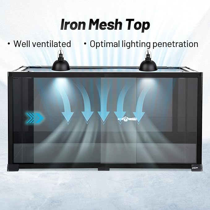 - 【GOOD VENTILATION AND UVB/HEAT IRRADIATION】Screen top provides ventilation and allows uvb and infrared penetration. Front sliding doors can open easily to feed your pet and prevent escape with the secure lock.