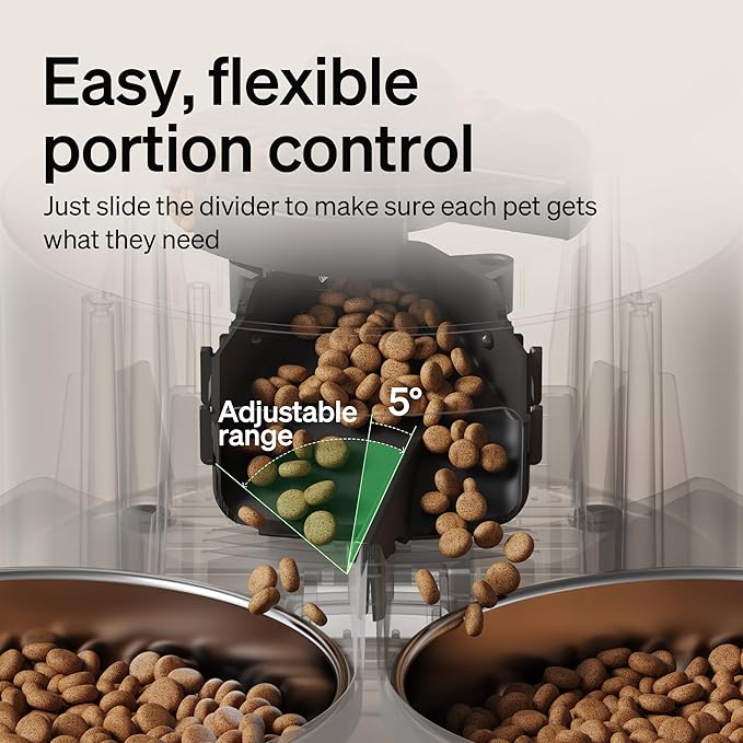 - Feed Two Cats: PETLIBRO automatic cat feeder for two cats comes with an adjustable meal splitter. The unique movable meal splitter ensures food is distributed evenly, and the size of the portions can be adjusted to suit the needs of different cats and dogs. So you can be sure your pets wonβt have any fights. And you can check the feeding records to ensure your cat or dog has been fed on a set schedule by APP and also can be controlled from multiple family membersβsmartphones.