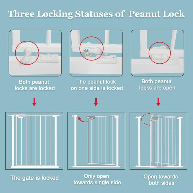 - 【Multiple modes】 Our triple lock gate has various statuses to meet your multiple needs in life. When all three locks are locked, little babies or pets will be stopped by it. At the bottom , there are two peanut locks to control the opening direction and locking. If the peanut lock on one side is locked, the gate can only be opened towards single side. If both peanut locks are open, the gate can swing both ways. Besides, it will stay open at 90 degrees and auto-close when it's less than that.