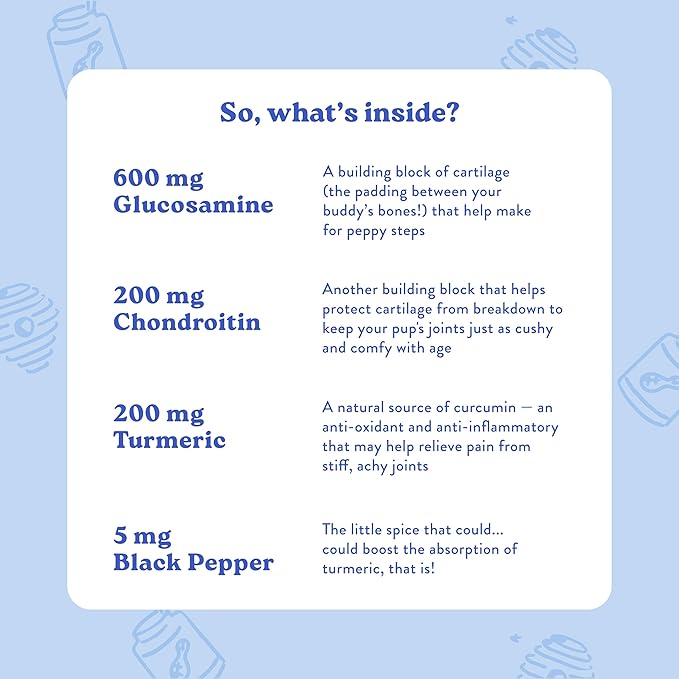 - Let’s keep the pep in your pup’s step! An advanced (... and extra tasty!) formula to help your dog move more comfortably and confidently – without the artificial flavors.