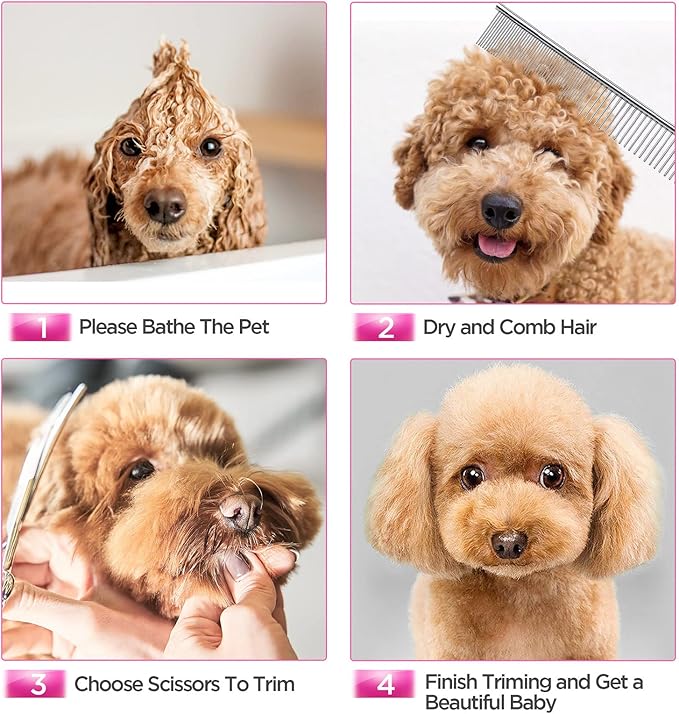 - 【5 in 1 Dog Grooming Scissors Set】The dog grooming scissors set comes with 1 straight scissors, 1 thinning scissor, 1 curved scissor, 1 grooming comb and 1 storage case