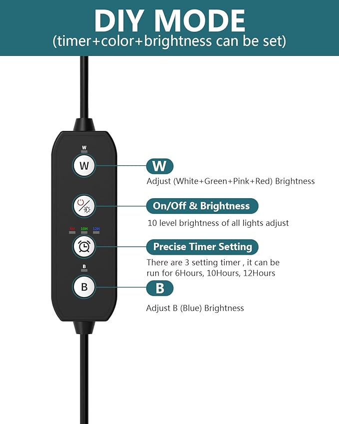 - ★[DIY MODE]: Time, Colour and Brightness 3 setting choose. Timing (Timer control key): 3 choices timer running for 6 hours, or 10 hours, or 12 hours; Brightness/On-Off key: 10 level brightness and Switch function. Colour(W/B key): 3 colour modes choose, All lights on, White/Red/Green/Pink, Only Blue