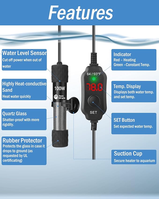 - DRY RUN / OVERHEATING PROTECTION – Full consideration of safety. With the multiple protections this fish tank heater will stop working when the water level is lower than the minimum water level (DRY RUN PROTECTION) or when the water temperature exceeds 97F (OVERHEATING PROTECTION). You are free from “cooking fish”!